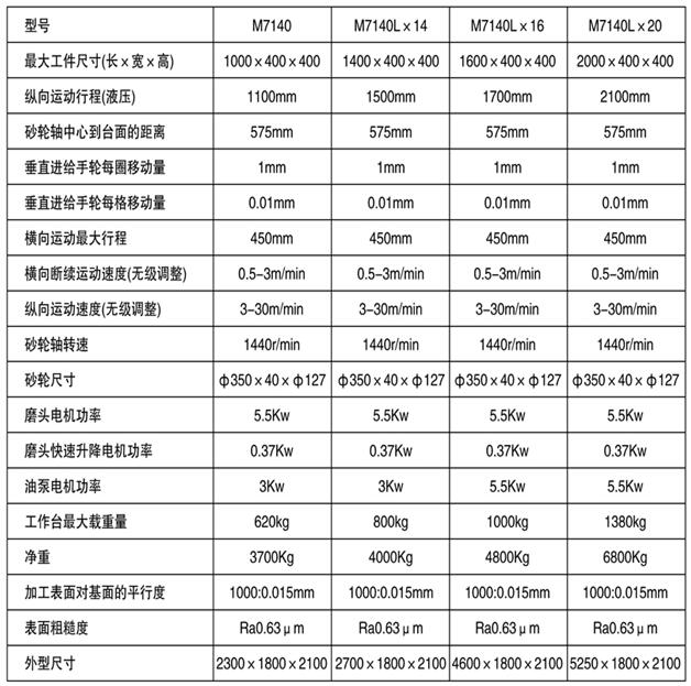 性能及工作特點: 此平面磨床以砂輪周邊或側(cè)面磨削工件的平面,工件可以固定在工作臺上,或吸牢在電磁吸盤上,其材質(zhì)可以是鋼、鑄鐵、石墨、或有色金屬。機床工作臺的左右和磨頭的前后運動都是用液壓驅(qū)動,無極調(diào)速。磨頭的前后運動也可手動操作。磨頭的垂直方向除手動進刀外還配有快速升降機構(gòu),減輕勞動強度提高效率。主要技術規(guī)格參數(shù)